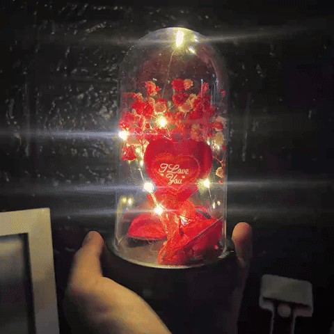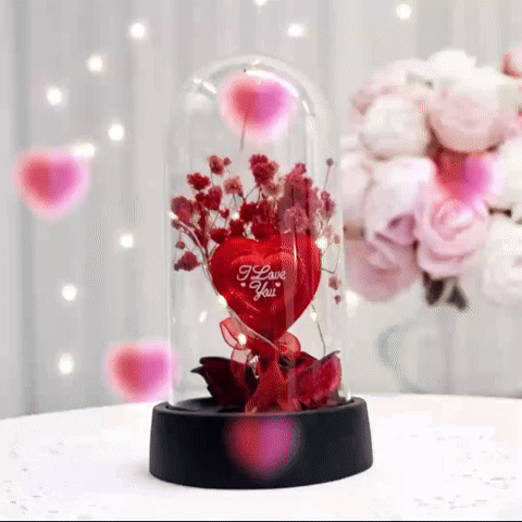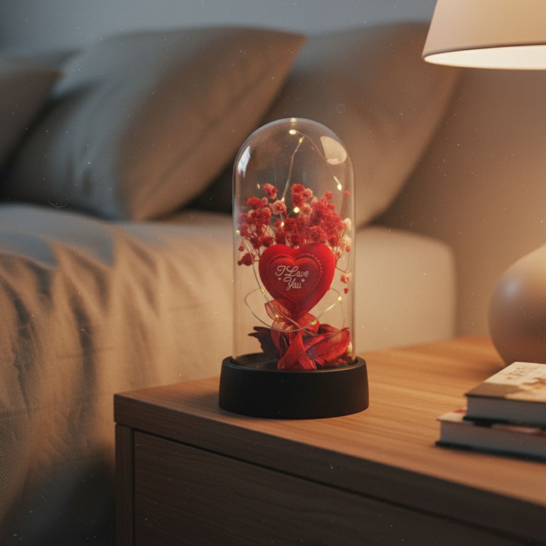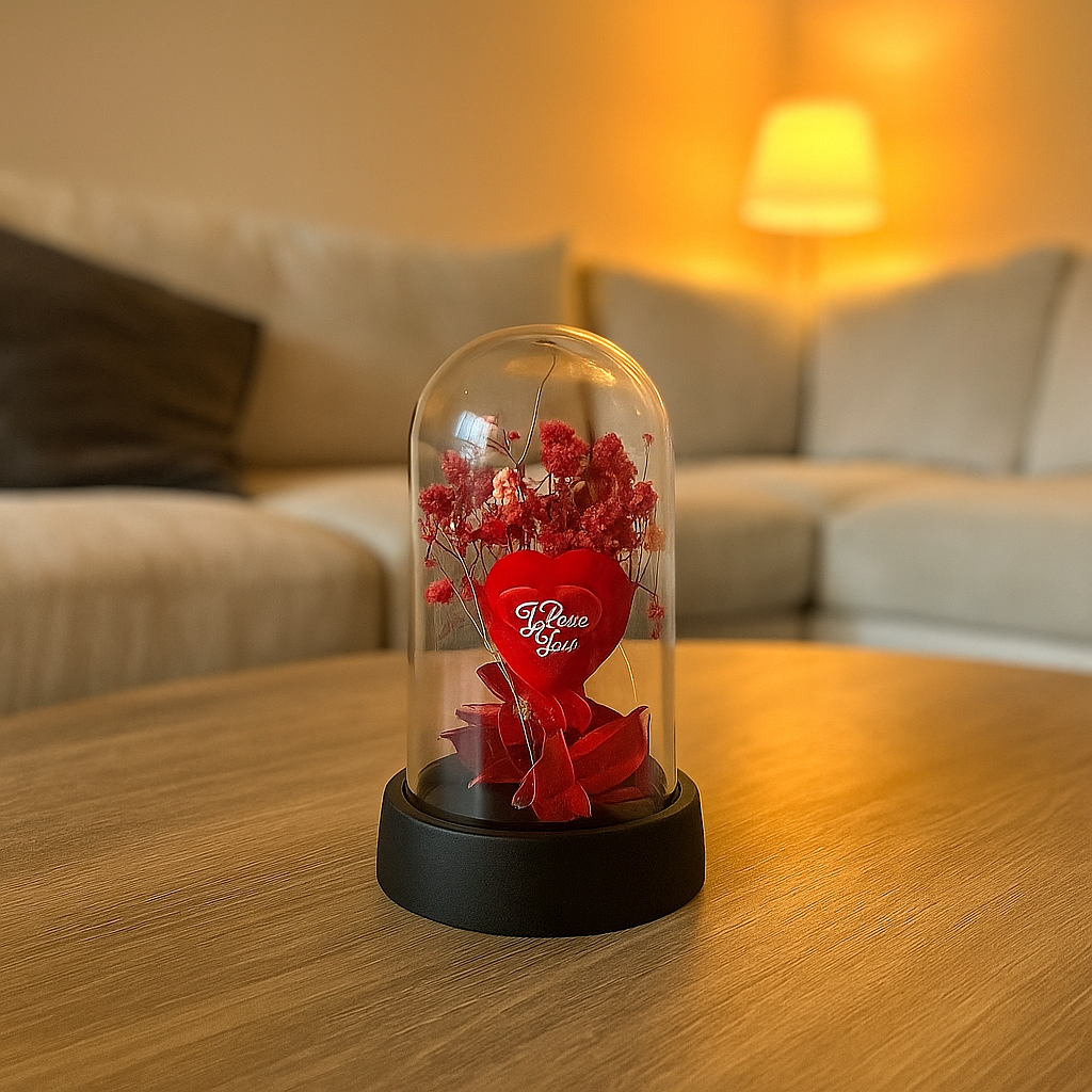 - Diseño Único: Cúpula de cristal que protege un delicado arreglo de flores inmortales y un corazón de felpa con el mensaje "I Love You".